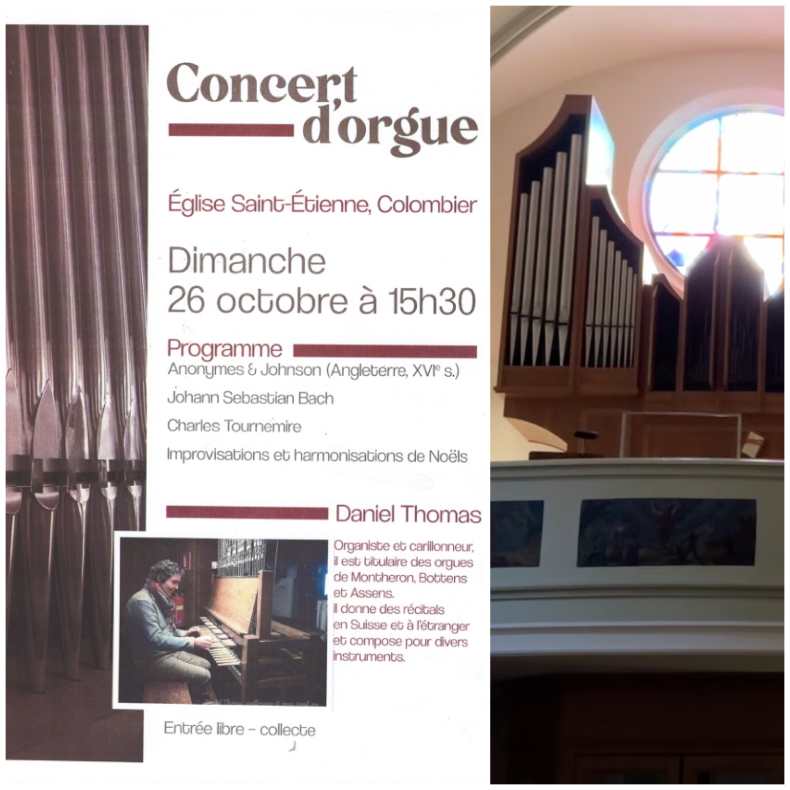 Concert Dimanche, 26 octobre 2025 17:00 église Saint-Étienne, Colombier NE Daniel Thomas aux orgues. Domenico Scarlatti, sonates, anonymes anglais, Thomas Tallis, Charles Tournemire, improvisations. Entrée libre, collecte