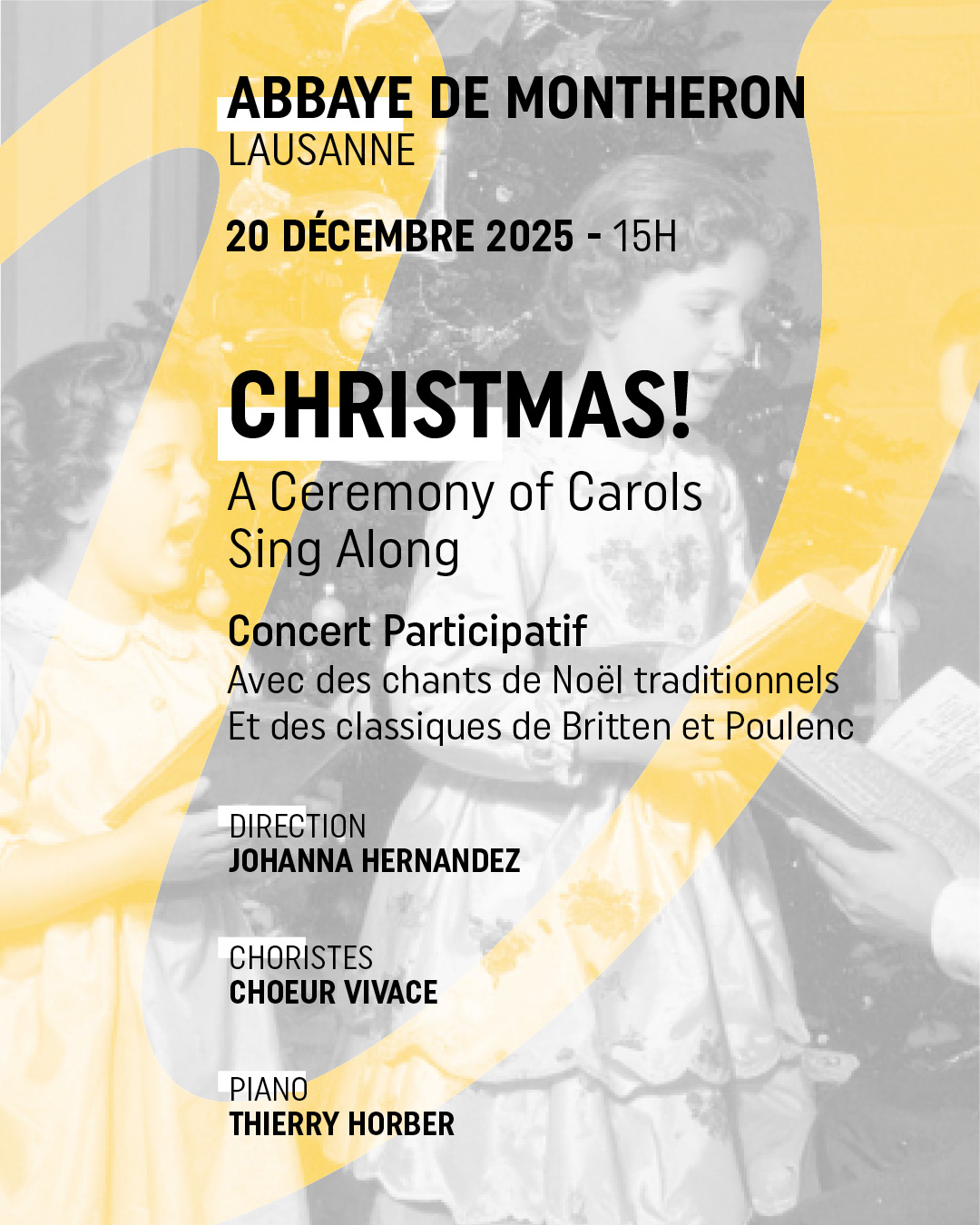 Abbaye de Montheron Rte de l’Abbaye 3, Montheron (Lausanne), Vaud, SuisseConcert Samedi 20 décembre à 15 h - Abbaye de Montheron Christmas A Ceremony of Carols, Sing along. Concert de Noël et chantée avec le Choeur Vivace Concert participatif Avec des chants de Noël traditionnels et des classiques de Britten et Poulenc. Johanna Hernandez, direction, Thierry Orber au piano. Entrée libre, collecte (prix conseillé : 30.- plein, 20.-… Lire la suite »