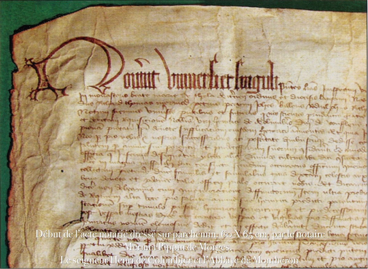 En l’an du Seigneur 1425, le 8 décembre, dans le monastère Sainte Marie de Thela [ancien nom de Montheron] de l’ordre de Cîteaux, dans le diocèse de Lausanne, nous, Pierre Barberii, abbé, Pierre de Chinaul, prieur, Girard Mermini, Girard Richard, Thomas Mermod, Pierre Perrini, Jean Billens, Rodolphe Richard, Jean Raballiod, Jean Ouban, Jean Bergier et Rodolphe Sarraceni, tous religieux du couvent, faisons savoir que, à la demande d’Henri de Colombier, seigneur de Vufflens-le-Château, pour le salut de ses parents et de ses ancêtres, nous célébrerons dans notre monastère les offices mentionnés ci-après.